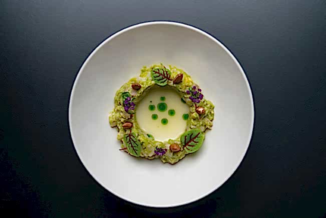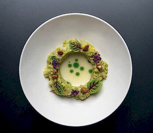 - Sea bream tartare with avocado, smoked almonds and yuzu dressing