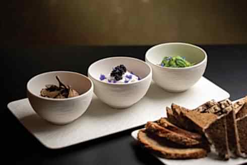 Kale and basil pesto dip on crackers - Wild mushroom and truffle patè on crackers Taramosalata (Greek fish Roe dip) on crackers
